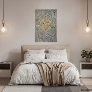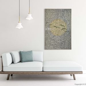 Tauchen Sie ein in eine Welt der Harmonie mit dem Bild Abstract Moronta, das die Ruhe der Natur in ihrer reinsten Form einfängt. Das zentrale Element ist eine goldene, kreisförmige Sonne, die sanft die neutrale graue und beigefarbene Moostextur beleuchtet. Grüne Vögel in der Luft verleihen dem Bild Dynamik und eine tiefere symbolische Bedeutung, die an Freiheit und Unabhängigkeit der Natur erinnert.
