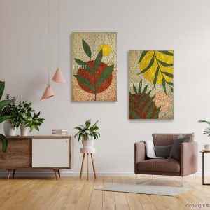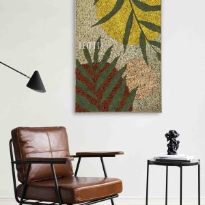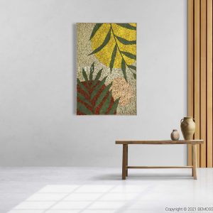 Entdecken Sie die faszinierende Schönheit des Moosbilds Abstract Soito! Grüne Blätter heben sich vom warm getönten rot-beigen Hintergrund ab, während leuchtend gelbe Kreise an sonnige Tage erinnern. Dieses pflegefreie und ökologische Bild bringt die Harmonie der Natur in Ihr modernes Zuhause.