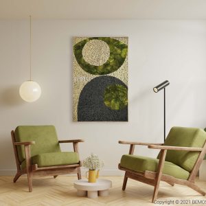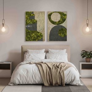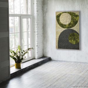 Dominante kreisförmige Motive in sattem Grün stehen im spannenden Kontrast zu tiefem Schwarz und einem sanft cremefarbenen Hintergrund. Die hügelige Textur des Mooses verleiht dem Bild eine spürbare Tiefe und verbessert zugleich die akustischen Eigenschaften des Raums – für ein ruhigeres und angenehmeres Ambiente.