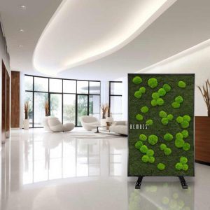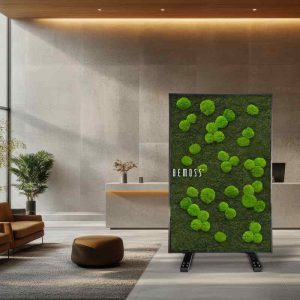 Der doppelseitige Moos Raumteiler FLACHMOOS & KUGELMOOS LIGHT ist eine einzigartige Kombination aus Dekoration und Funktionalität, die Ihren Raum perfekt belebt. Hergestellt aus 100% natürlichem konserviertem Moos, ist er ökologisch, hypoallergen und pflegeleicht. Ideal für Büros, Wohnungen oder Gewerberäume, schafft er dank seiner akustischen Eigenschaften Ruhe und Harmonie.
