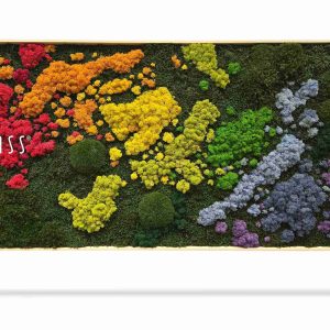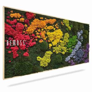 Das Moosbild BEMOSS® ORTHO IRIS ist eine wahre Farbexplosion und bringt die gesamte Schönheit der Natur in künstlerischer Form an Ihre Wand. Auf einer Basis aus tiefgrünem Flachmoos entstehen auffällige Strukturen aus Islandmoos in kräftigen Nuancen – von Rubinrot über Sonnenorange, sattem Gelb und frischem Grün bis hin zu zartem Himmelblau und intensiven Violetttönen. Die farbliche Komposition erinnert an einen dynamischen Farbverlauf oder einen lebendigen Farbwirbel, der pure Lebensfreude ausstrahlt.