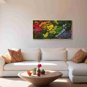 Bringen Sie Farbe in Ihr Zuhause mit dem farbenfrohen Moosbild BEMOSS® ORTHO IRIS. Dieses Kunstwerk wird von Hand gefertigt in der Schweiz aus 100% natürlichem, konserviertem Moos und ist vollkommen pflegefrei. Die Kombination aus leuchtendem Rot, Orange, Gelb, Grün, Blau und Violett erinnert an ein abstraktes Regenbogenmuster und sorgt für Frische und positive Energie in jedem Raum.