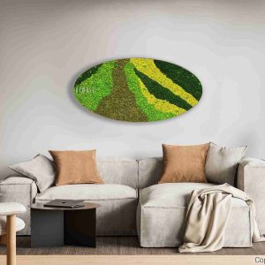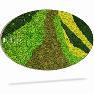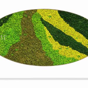 Moosbild Ellipse BEMOSS® ORTHO CARROT ist ein Kunstwerk, das von der Natur selbst geschaffen wurde. Wellenartige Streifen in grünen und gelben Tönen erzeugen einen dynamischen visuellen Effekt, der an die Bewegung des Windes über Wiesen oder sanfte Hügel beim Sonnenuntergang erinnert. Dieses Design wird jeden Raum beleben und ihm Originalität und Charakter verleihen.