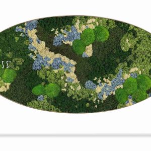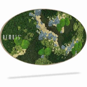 Das Moosbild Ellipse BEMOSS® ORTHO ICE ruft die Ruhe eines Waldes hervor, der im morgendlichen Frost gehüllt ist. Die Verschmelzung von hellen Grüntönen des stabilisierten Mooses mit sanften hellblauen Tönen schafft eine harmonische Komposition, die mit ihrer Originalität verzaubert. Dieses wartungsfreie und ökologische Bild bringt die Natur direkt zu Ihnen und erfordert keinerlei Pflege.