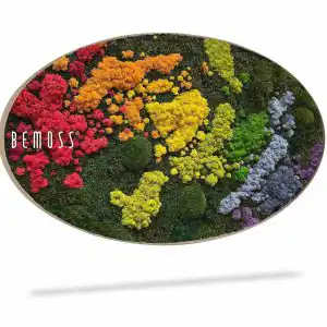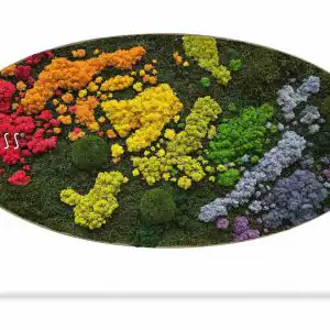 Das Moosbild Ellipse BEMOSS® ORTHO IRIS ist ein außergewöhnliches Wandobjekt, das Natürlichkeit, Farbe und künstlerisches Design auf einzigartige Weise vereint. Die Ellipsenform verleiht dem Bild eine weiche, moderne Silhouette, während die Komposition aus konserviertem Kugelmoos, Flachmoos und Islandmoos in einem farbintensiven Regenbogenverlauf begeistert. Die satte Kombination aus Rot, Orange, Gelb, Grün, Blau und Violett wirkt lebendig und zieht alle Blicke auf sich.