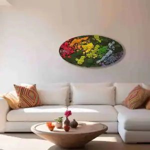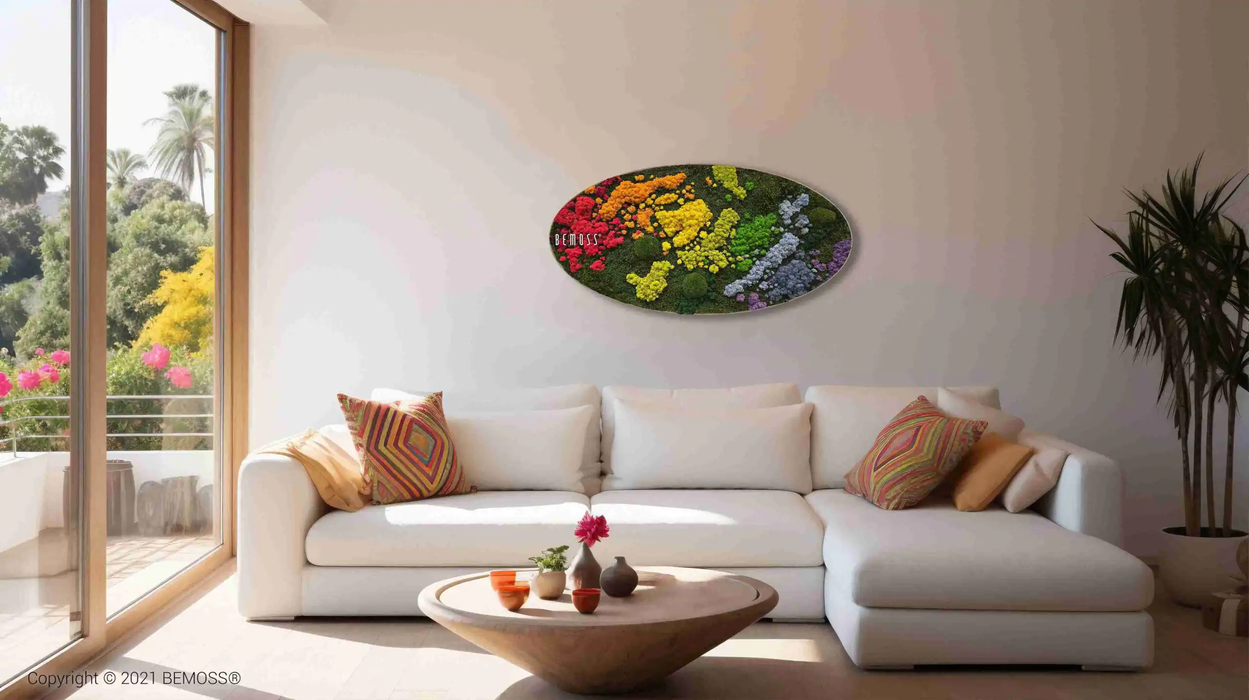Einzigartiges Design trifft auf Natur. Das Moosbild Ellipse BEMOSS® ORTHO IRIS bringt leuchtende Farben in harmonischer Ellipsenform an Ihre Wand. Es wird aus 100 % natürlichem konserviertem Moos in verschiedenen Arten und Farben gefertigt. Dieses dekorative Kunstwerk ist pflegefrei, hypoallergen und ökologisch, wodurch es sich perfekt für moderne, stilvolle Innenräume eignet. Jedes Stück wird handgefertigt in der Schweiz und kann individuell nach Maß gestaltet werden.