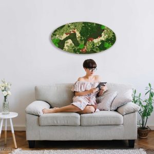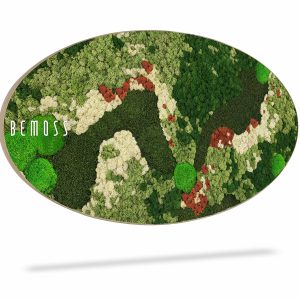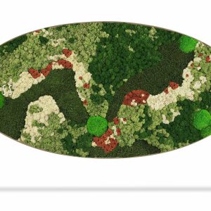 Moosbild Ellipse BEMOSS® ORTHO MANGO ist eine harmonische Verbindung von natürlichen Elementen, die einen einzigartigen Blick auf eine vom Sonnenlicht erhitzte Landschaft vermitteln. Die dominierenden Grüntöne in Kombination mit ziegelroten und cremefarbenen Akzenten erzeugen eine warme und frische Wirkung, während die Anordnung der Moostexturen und -muster an Wiesenpfade oder sanfte Flüsse erinnert.