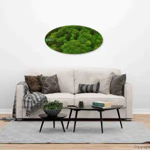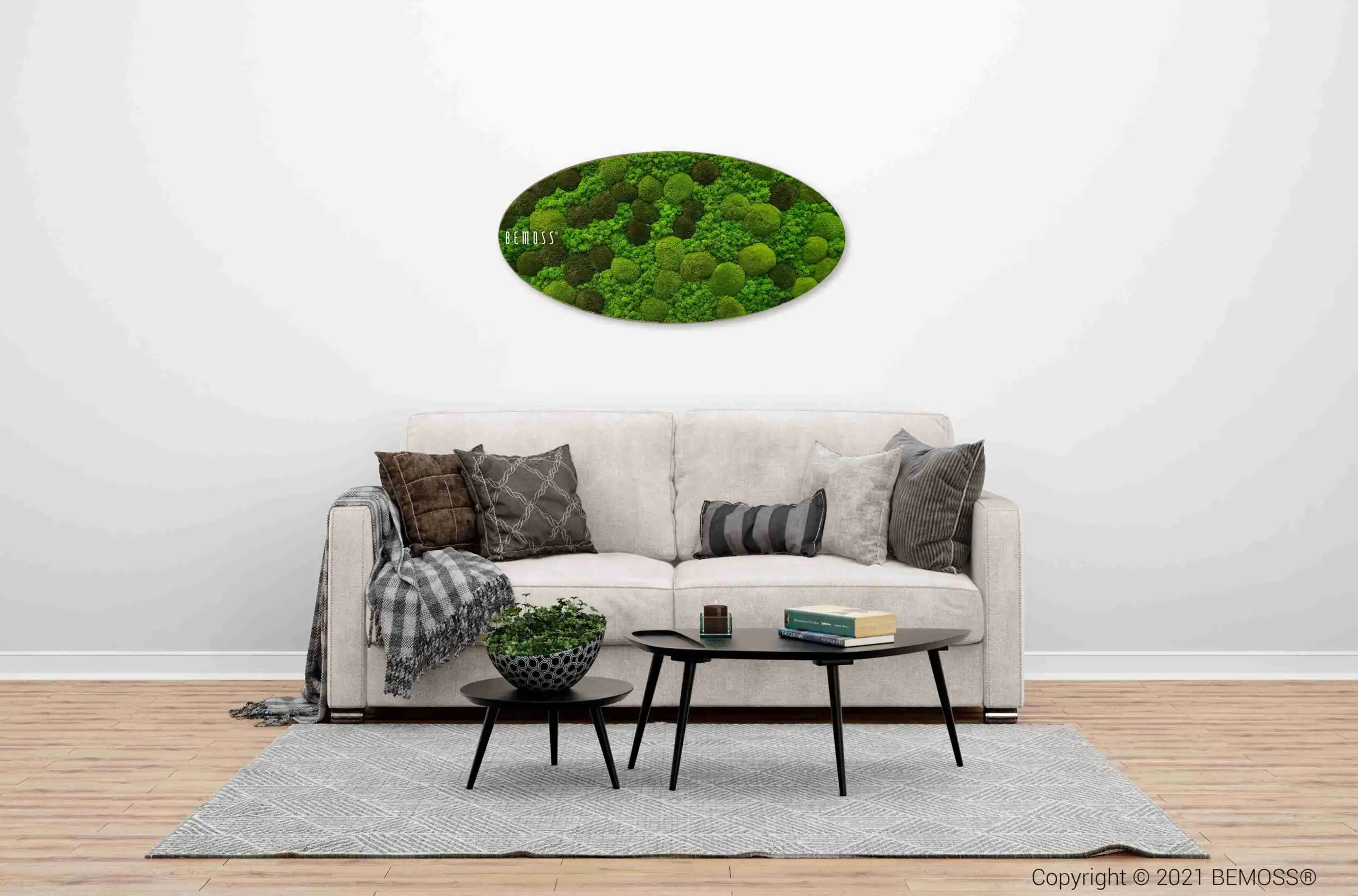 Verleihen Sie Ihrem Interieur mit dem eleganten Moosbild BEMOSS® ORTHO MONETO in Ellipsenform einen Naturakzent! Dieses einzigartige Dekorationsstück ist handgefertigt aus 100% natürlichem stabilisiertem Moos und ist wartungsfrei, was bedeutet, dass es seine Schönheit ohne jegliche Pflege behält. Die reiche Textur und die verschiedenen Grüntöne verleihen Ihrem Raum Frische und eine angenehme Atmosphäre.