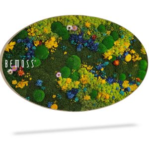 Moosbild Ellipse BEMOSS® ORTHO TORRES ist ein Kunstwerk, das eine einzigartige farbliche Symphonie in Ihr Interieur bringt. Die Oberfläche des Bildes wird von stabilisiertem Moos und reichhaltigen stabilisierten Blumen in Gelb-, Blau-, Rot- und Rosatönen geschmückt, die das Gefühl einer blühenden Frühlingswiese hervorrufen. Jedes Detail ist sorgfältig angeordnet, um die Essenz der Natur einzufangen und Harmonie in Ihnen zu wecken.
