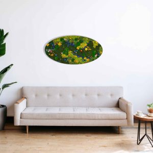 In unserem Online-Shop können Sie aus Standardgrößen wählen, aber wenn Sie spezielle Anforderungen haben, fertigen wir das Bild gerne nach Maß. Diese Ellipse, die an eine lebendige Wiese erinnert, ist das perfekte Accessoire, das jeden beeindruckt und Ihrem Raum einen einzigartigen Hauch von Natur verleiht.