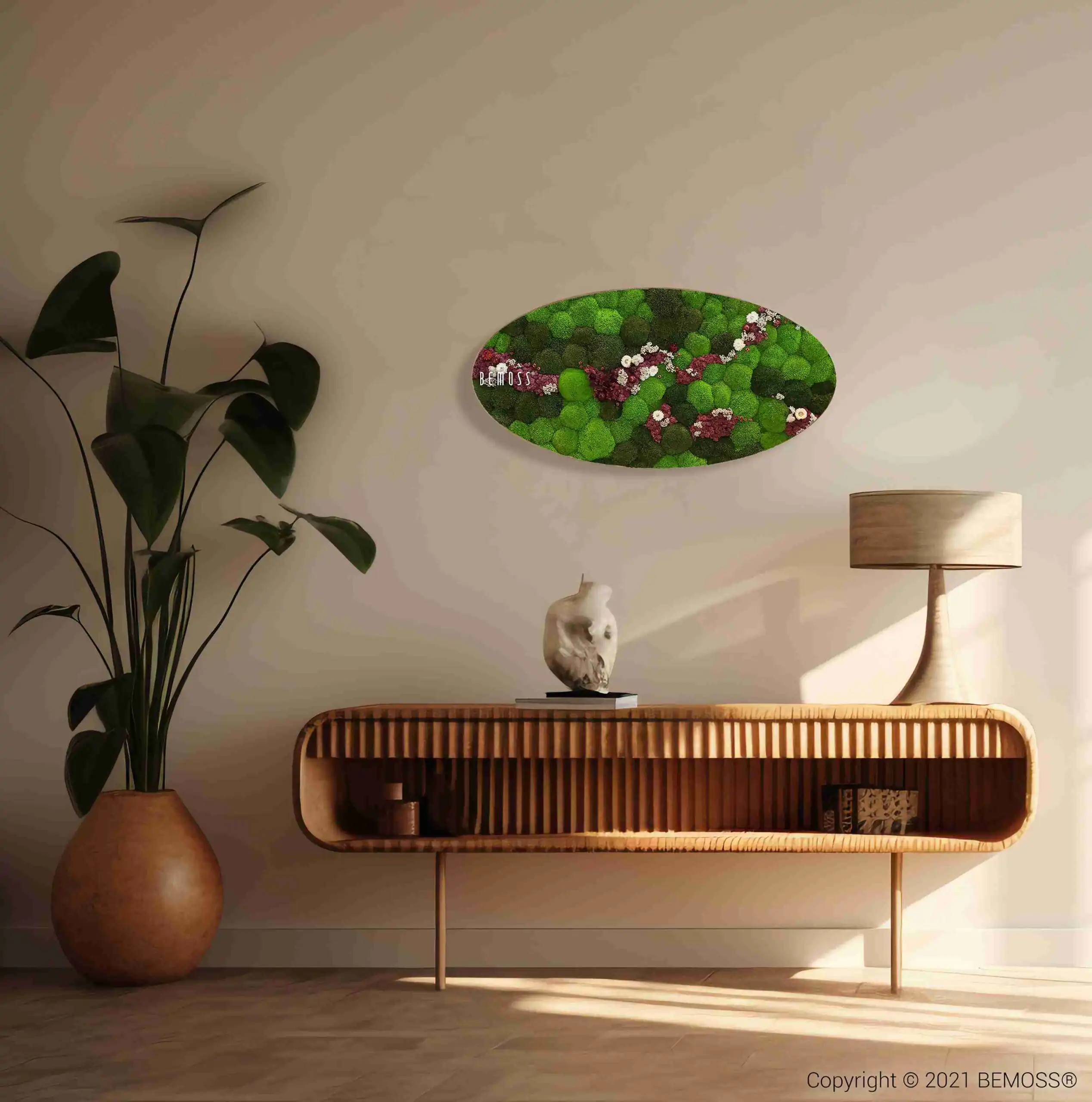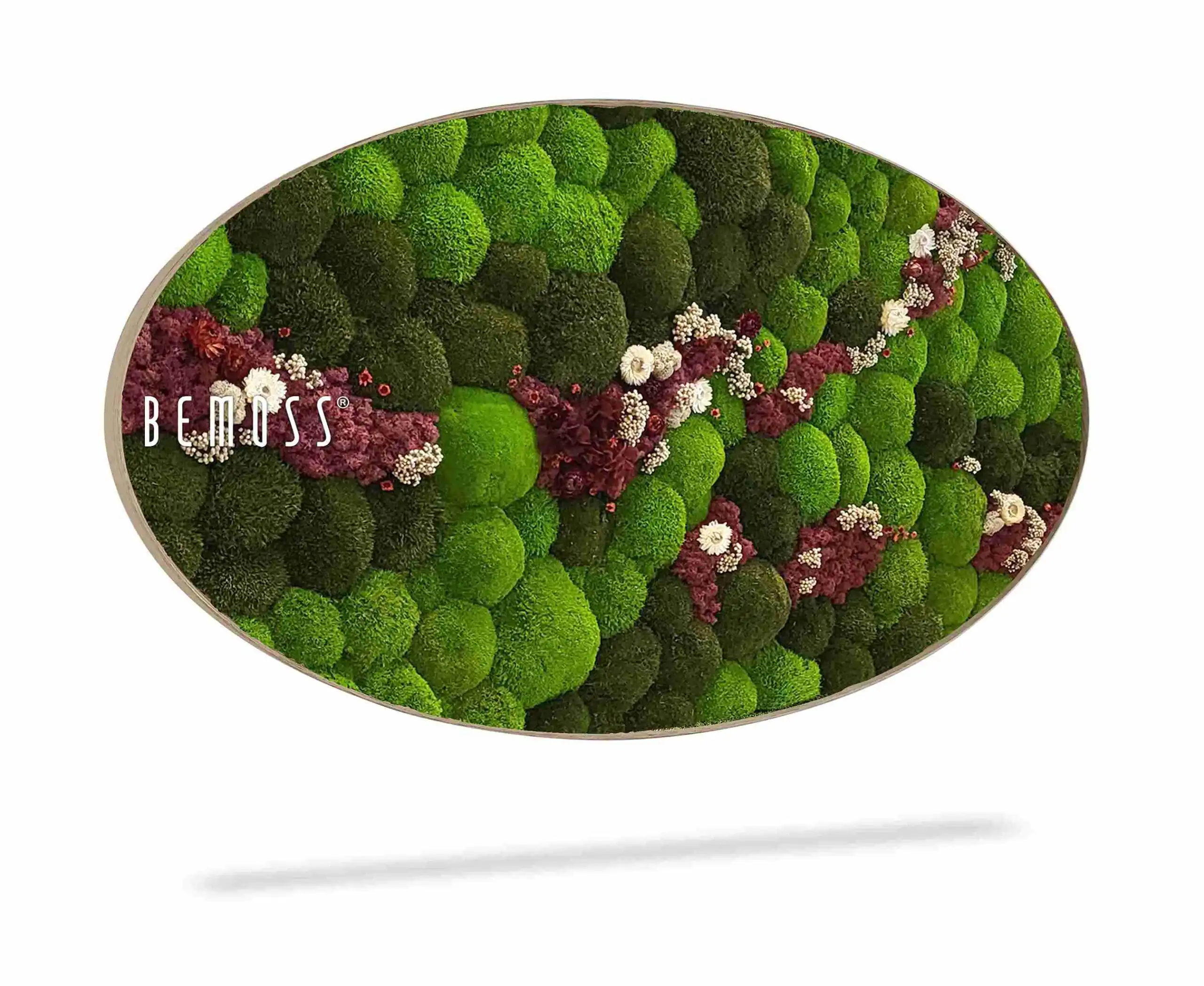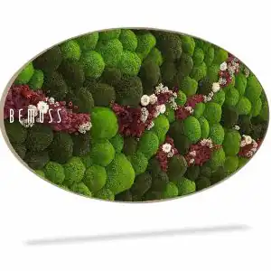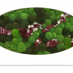Verleihen Sie Ihrem Raum mit dem einzigartigen Moosbild Ellipse KUGELMOOS COSMO Burgundy Leben, das die üppige grüne Natur mit tiefen burgunderroten Akzenten verbindet. Dieses handgefertigte Bild aus 100% natürlich stabilisiertem Moos ist pflegefrei, hypoallergen und ökologisch. Sanfte cremefarbene Blumen verleihen der Komposition Eleganz und Kontrast und schaffen ein harmonisches visuelles Erlebnis.