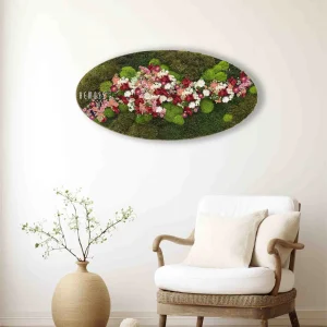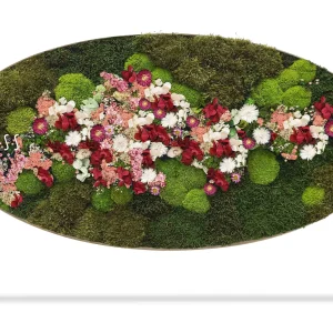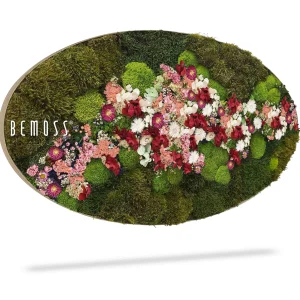 Das Moosbild Ellipse PFLANZEN Acebo PINK bringt einen sofistischen Hauch in Ihr Zuhause oder Büro. Rosa und rote Blumen, ergänzt durch weiße Akzente, bilden eine lebendige Farbpalette, die sofort die Aufmerksamkeit auf sich zieht und jedes Interieur in ein harmonisches Refugium verwandelt. Die Kombination aus sanften Tönen und dem frischen Grün des stabilisierten Mooses vermittelt ein Gefühl von Natürlichkeit und Ruhe.