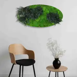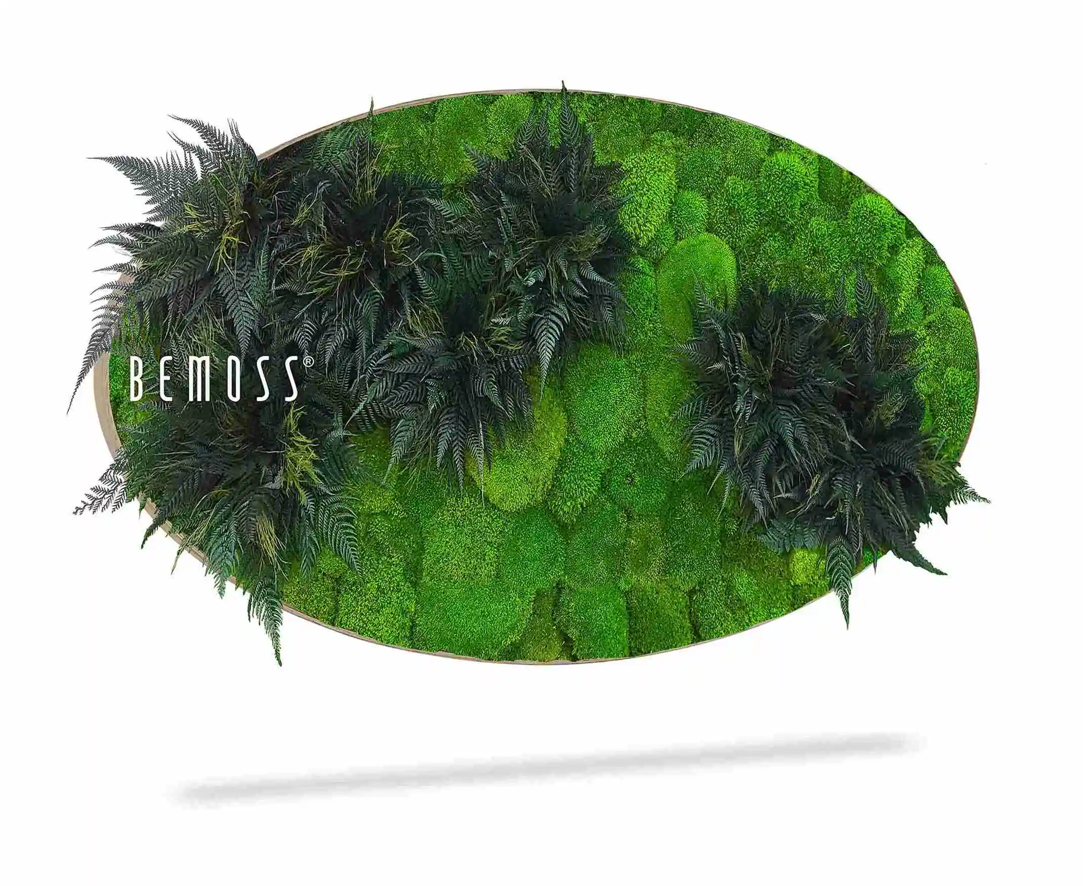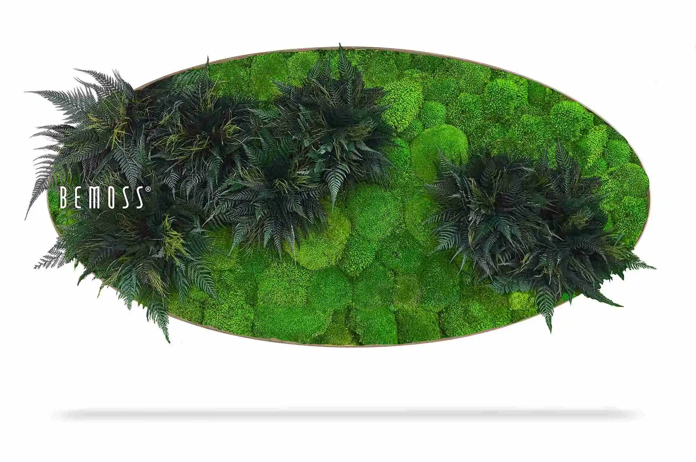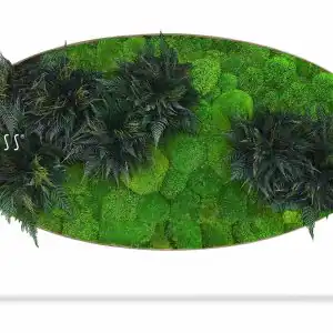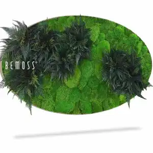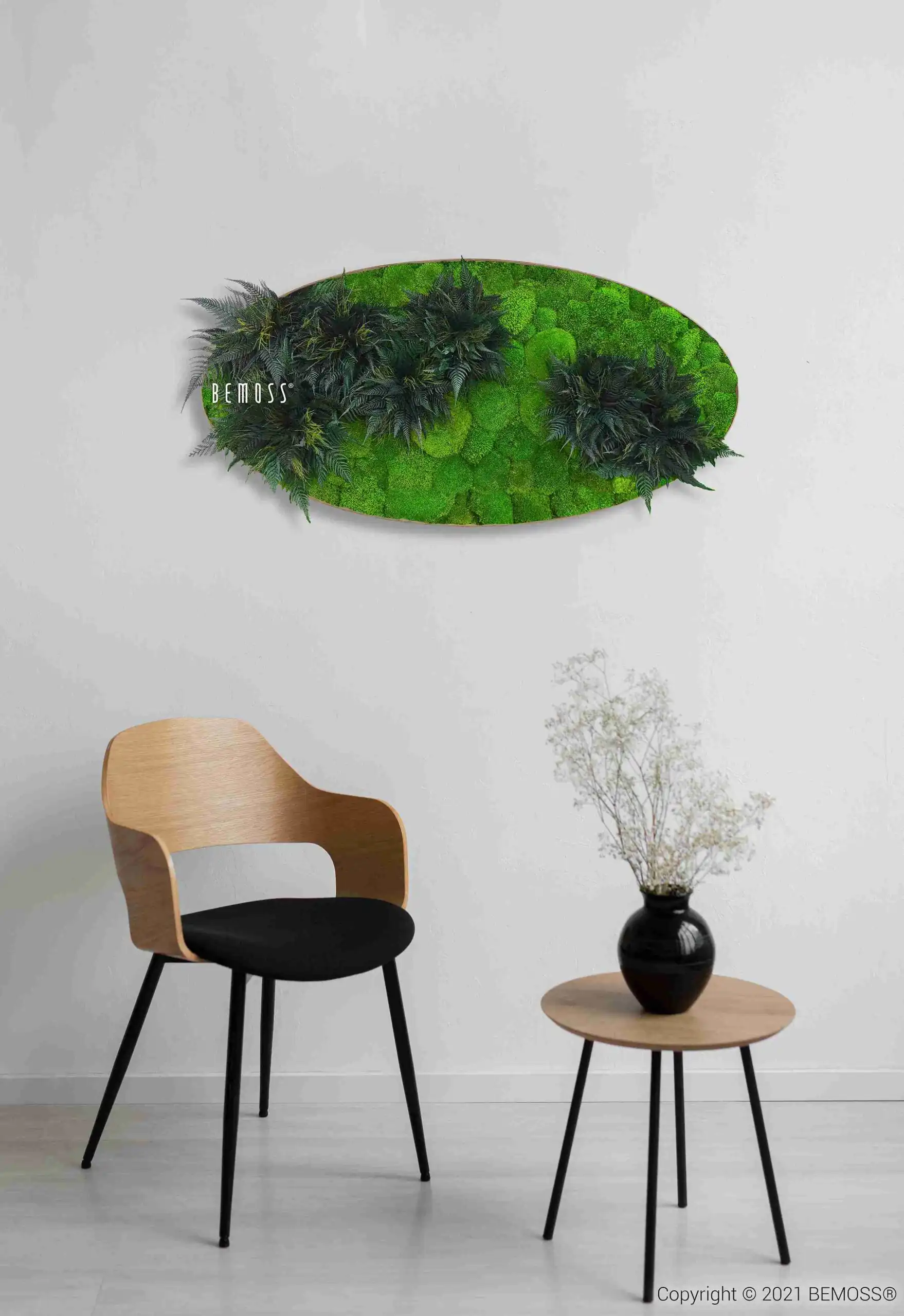 Das Moosbild Ellipse PFLANZEN Colila ist die perfekte Verbindung von Natur und Design, die Frische und Ruhe in Ihr Interieur bringt. Die Kombination aus 100% natürlich stabilisiertem Moos und sorgfältig ausgewählten Pflanzenelementen schafft eine natürliche Komposition voller Texturen und Farben. Dunkelgrüne Farne und zarte Blätter heben sich vor dem dichten Mooshintergrund ab und verleihen dem Bild Tiefe und einen authentischen Natur-Look.