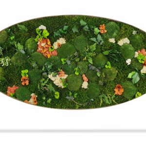 Das Moosbild Ellipse PFLANZEN Mesia Mango bringt einen einzigartigen Hauch der Natur in Ihr Interieur mit einer harmonischen Kombination aus sattem Grün und warmen Mangofarben. Dieses ökologische und hypoallergene Bild ist handgefertigt in der Schweiz.