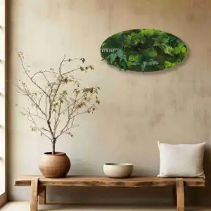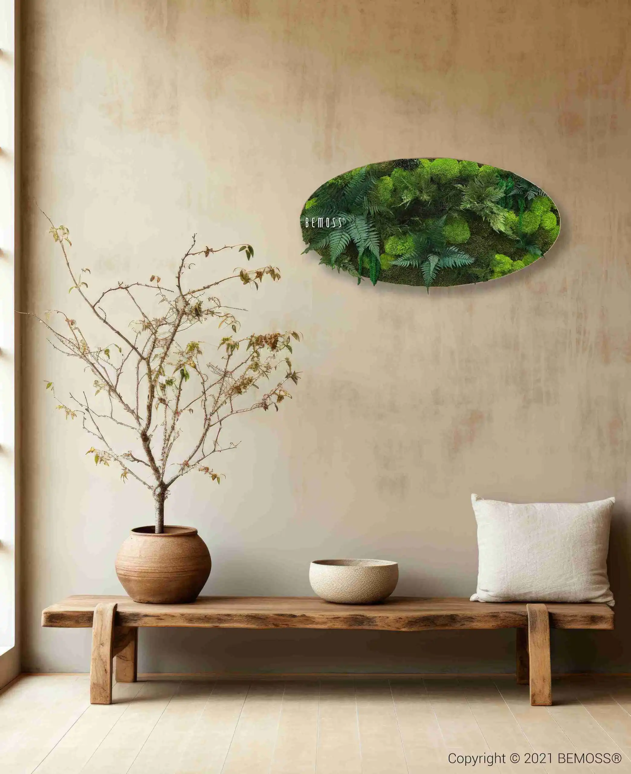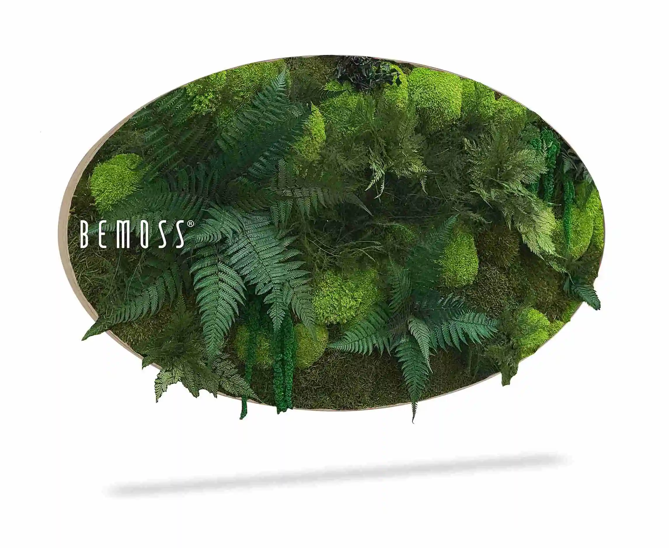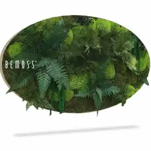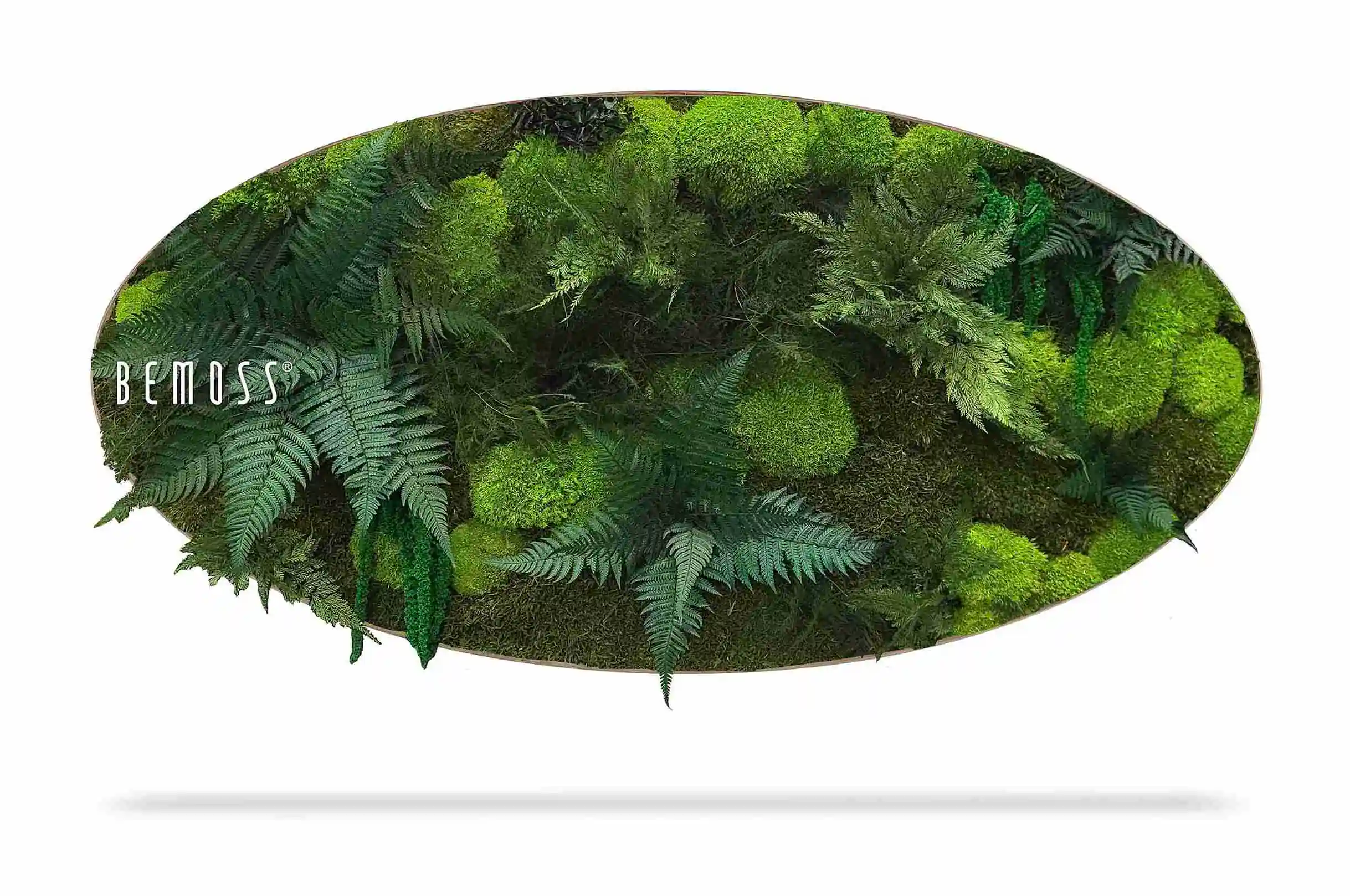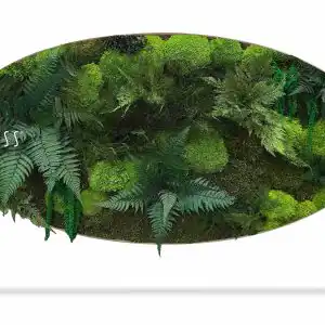Das Moosbild Ellipse PFLANZEN Vigo ist ein einzigartiges Kunstwerk, das Frische und ein Stück Natur in Ihr Zuhause oder Büro bringt. Es kombiniert 100% natürlich stabilisiertes Moos mit detailliert verarbeiteten Pflanzenelementen, die den Eindruck einer echten grünen Oase erzeugen. Dichte Farne und zarte grüne Akzente verleihen dem Bild Dynamik, wodurch es zu einem auffälligen Element in Ihrem Interieur wird.