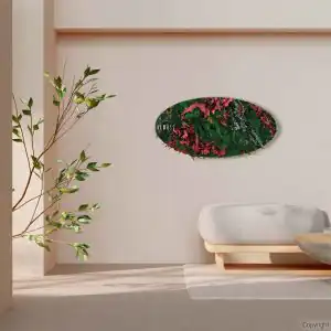 Das Moosbild Ellipse PFLANZEN Zorita ist eine faszinierende Verbindung von Natur und Kunst, die jeden Raum mit ihrer dynamischen Farb- und Formensprache belebt. Die reichen grünen Texturen des stabilisierten Mooses werden durch tiefe rote, orange und weinrote Akzente ergänzt, die eine herbstliche Landschaft voller Wärme und Leben evozierend. Diese Dekoration erinnert an den Sonnenuntergang, der durch dichte Wälder bricht, und wird zu einem markanten Element Ihres Interieurs.