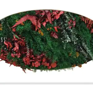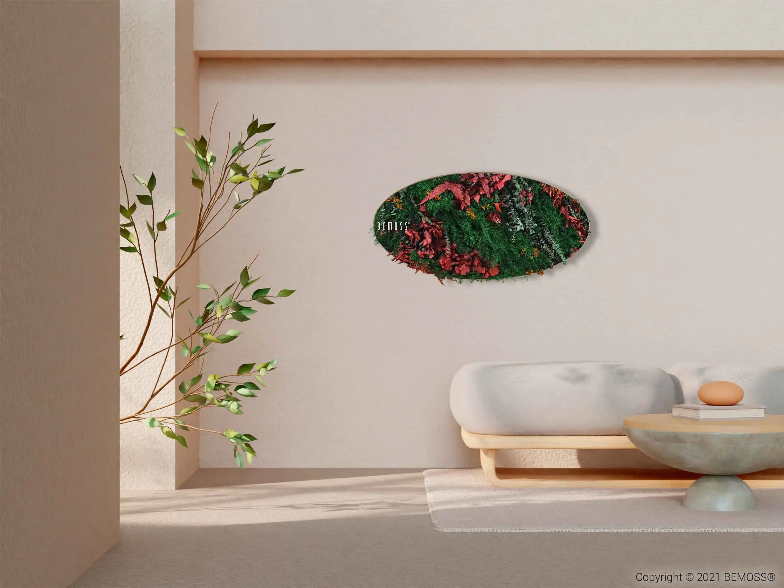 Das Moosbild Ellipse PFLANZEN Zorita ist ein Meisterwerk, das Sie sofort in eine malerische Herbstlandschaft entführt. Der Grund des Bildes besteht aus satten Grüntönen des stabilisierten Mooses, die ein Gefühl von Frische und Tiefe erzeugen. Diese natürlichen Texturen werden durch markante rote und weinrote Blätter ergänzt, die mit zarten orangefarbenen und gelben Akzenten verziert sind und die Farben eines reifen Herbstwaldes widerspiegeln. Die Komposition wirkt wie eine künstlerische Darstellung, die die Zerbrechlichkeit und Schönheit der Natur in ihrer vollendeten Form einfängt.