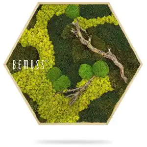 Das Moosbild Hexagon BEMOSS® ORTHO BORJA ist ein wunderschönes Beispiel dafür, wie Natur stilvoll in den Innenraum integriert werden kann. Dieses einzigartige Bild kombiniert satte grüne und leuchtend gelbe Moosfarben mit authentischen Zweigen, die den Eindruck eines Waldes direkt in Ihr Zuhause bringen. Die dynamische Anordnung von Farben und Texturen fügt dem Raum Harmonie und natürlichen Charme hinzu.