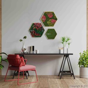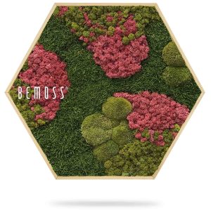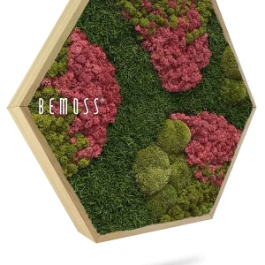 Das verwendete stabilisierte Moos ist nicht nur ökologisch und hypoallergen, sondern auch völlig pflegefrei, was bedeutet, dass das Bild seine natürliche Schönheit und Farben ohne jegliche Pflege behält. Die hexagonale Form ist ein modernes Element, das alleine hervorragend zur Geltung kommt, aber ebenso leicht mit anderen Bildern in verschiedenen Formen und Farben kombiniert werden kann.