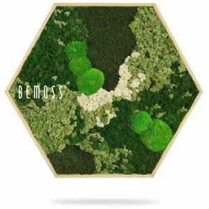 Der hexagonale Rahmen sorgt für eine moderne, außergewöhnliche Form, die in jeder Umgebung hervorsticht. Ökologisches und hypoallergenes Moos erfordert keinerlei Pflege und behält über Jahre hinweg seine natürliche Frische und Farbintensität. Dieses Bild ist ideal für Naturliebhaber, die auch ein wartungsfreies Design zu schätzen wissen.