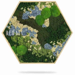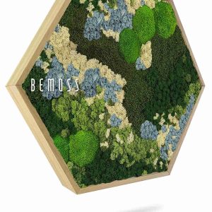 Das Moosbild Hexagon BEMOSS® ORTHO ICE ist in Standardgrößen erhältlich, kann aber auch individuell nach Ihren Wünschen angepasst werden. Der natürliche Holzrahmen rundet das Gesamtbild perfekt ab und lässt sich sowohl in moderne als auch klassische Einrichtungen mühelos integrieren.