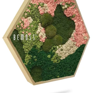 Entdecken Sie die sanfte Eleganz des Moosbilds Hexagon BEMOSS® ORTHO PINK, das mit seinem Design jeden Raum zum Strahlen bringt. Dieses besondere Kunstwerk kombiniert zarte Rosatöne mit frischem Grün und schafft so eine harmonische Komposition, die Ruhe und natürliche Schönheit ausstrahlt. Beigefarbene Akzente und kräftige Moosnuancen verleihen dem Bild eine lebendige, dreidimensionale Textur.