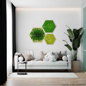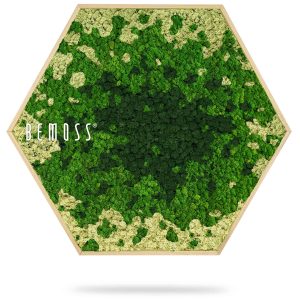 Das Moosbild Hexagon BEMOSS® ORTHO SPLASH Green besticht durch den Übergang von sanftem Beige zu sattem Grün – wie ein Blick in einen tiefen Wald. Dieses ökologische und hypoallergene Moosbild verleiht Ihrem Raum Ruhe und eine einzigartige, natürliche Ausstrahlung.