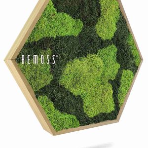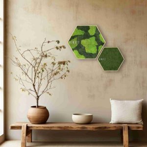 Die markante sechseckige Form und die Kombination aus hellen und dunkleren Grüntönen schaffen einen reizvollen Kontrast, der sowohl beruhigend als auch ausgleichend wirkt. Dieses Moosbild ist hypoallergen und ökologisch – ideal für alle, die auf ein gesundes und nachhaltiges Wohnumfeld achten. Dank seiner hervorragenden akustischen Eigenschaften verbessert es zudem die Klangatmosphäre im Raum.
