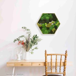 Das Moosbild Hexagon KUGELMOOS COSMO Lime ist ein außergewöhnliches Kunstwerk, das jeden Raum in einen Ort der Harmonie und natürlichen Schönheit verwandelt. Verschiedene Grüntöne des Mooses verbinden sich mit sanften weißen und frischen limettengrünen Akzenten, die dem Bild eine energetische und lebendige Ausstrahlung verleihen.