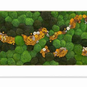 Das Moosbild KUGELMOOS COSMO Yellow ist eine harmonische Kombination aus frischen grünen Tönen und sonnigen Gelbnuancen, die an warme Sonnenstrahlen erinnern, die durch die Waldlandschaft strahlen. Die Komposition aus weichen Mooskugeln in verschiedenen Grüntönen wirkt natürlich und entspannend, während gelbe Blumen und Pflanzen dem Bild eine positive und energiegeladene Atmosphäre verleihen. Feine cremefarbene Details balancieren die Komposition aus und fügen Sanftheit und Harmonie hinzu.