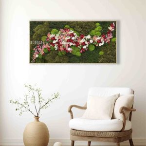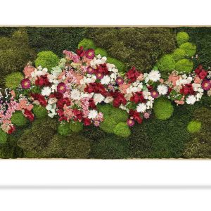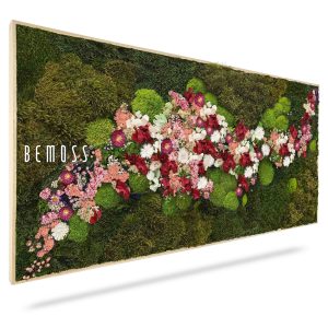 Bringen Sie romantische Harmonie der Farben in Ihr Interieur. Moosbild PFLANZEN Acebo PINK verzaubert mit der Kombination aus zarten Rosatönen, Rot und Weiß vor dem Hintergrund von sattem Grün. Dieses pflegeleichte Bild, hergestellt aus 100% natürlichem Moos, bringt Zartheit und Eleganz in den Raum, ergänzt durch die Energie der floralen Komposition.