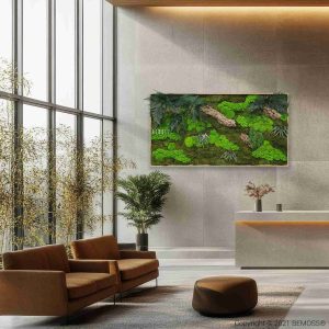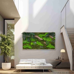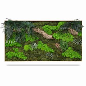 Im Vordergrund des Bildes finden wir wunderschön arrangierte Holzstücke, die sich natürlich mit den Moosflächen verbinden und das Bild zu einem visuellen Erlebnis machen. Dazu kommen zarte Pflanzen, die das Bild beleben und noch faszinierender machen. Diese natürlichen Elemente schaffen zusammen eine organische Harmonie, die Entspannung und Verbindung zur Natur in den Raum bringt.