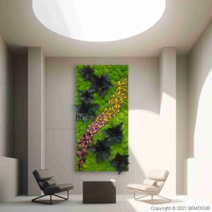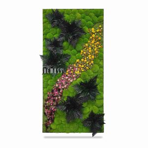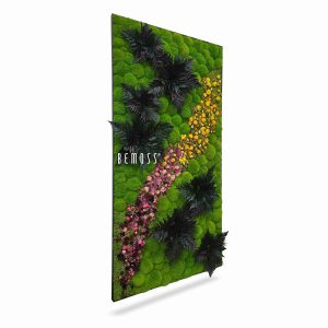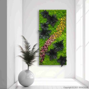 Die hellen Töne von gelben und rosafarbenen Blumen sind wunderschön im Kontrast zu den grünen Moosflächen angeordnet, wodurch ein einzigartiges, natürliches Muster entsteht. Dunkle, elegante Blätter ergänzen den Gesamteindruck des Bildes, das dynamisch, aber gleichzeitig harmonisch wirkt. Dieses Bild ist hypoallergen und ökologisch, was es zu einer idealen Ergänzung für jedes Zuhause macht, das auf Gesundheit und Nachhaltigkeit Wert legt.