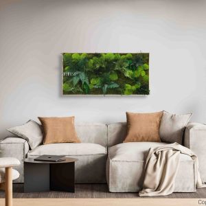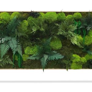 Moosbild PFLANZEN Vigo ist eine einzigartige Verbindung aus frischen Tönen des stabilisierten Mooses und eleganten Farnen, die den Eindruck einer dichten Waldnische erwecken. Die natürlichen Texturen und kontrastierenden Grüntöne vermitteln ein Gefühl von Ruhe und Verbindung zur Natur.