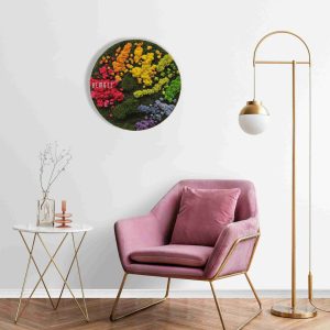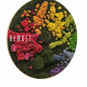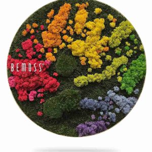 Das Moosbild Rund BEMOSS® ORTHO IRIS besticht durch seine organische Form und farbliche Vielfalt. Die runde Komposition vereint intensiv gefärbtes Kugelmoos, sanftes Flachmoos und strukturiertes Islandmoos in Regenbogenfarben – von kräftigem Rot über sonniges Gelb bis zu kühlem Blau und Violett. Diese Farbharmonie bringt frische Energie und Tiefe an jede Wand.