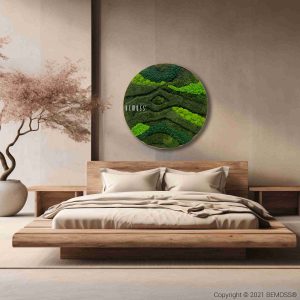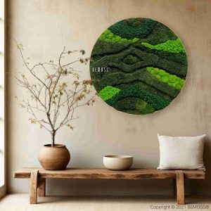 Das Design erinnert an geschwungene, dynamische Wellen, die sich in dunkleren und helleren Grüntönen abwechseln. Diese Form und Anordnung des Mooses ruft die ruhigen Ströme der Natur hervor, die sich durch die Landschaft winden – und bringt so ein Gefühl von Ruhe, Bewegung und Ausgeglichenheit in den Raum. Jedes Detail wurde sorgfältig arrangiert, um die Schönheit und ständige Bewegung der Natur einzufangen.