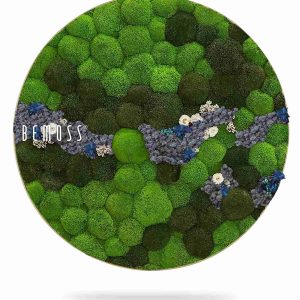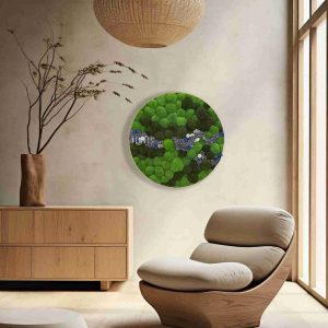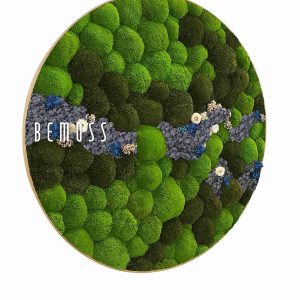 Moosbild Rund KUGELMOOS COSMO Blue ist ein außergewöhnliches Designelement, das die Schönheit der Natur mit moderner Ästhetik verbindet. Den Hauptteil des Bildes bilden grüne Mooskugeln in unterschiedlichen Nuancen, die eine dynamische und natürliche Oberfläche schaffen. Zarte blaue und cremefarbene Akzente aus stabilisierten Blüten setzen elegante Kontraste und verleihen dem Bild eine frische Ausstrahlung.