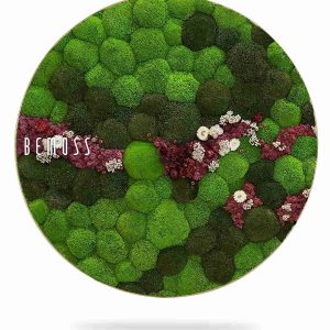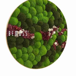 Moosbild Rund KUGELMOOS COSMO Burgundy ist die perfekte Verbindung natürlicher Texturen und raffinierten Designs. Die Basis des Bildes bildet eine satte grüne Komposition aus Mooskugeln in verschiedenen Nuancen, die eine angenehme Tiefe und einen natürlichen Effekt erzeugen. Eine fließende Linie aus bordeauxroten und cremefarbenen Blüten verleiht dem Bild Dynamik und einen eleganten Kontrast.