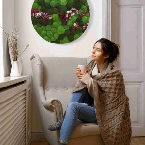 Verleihen Sie Ihrem Interieur einen Hauch von Natur mit dem Moosbild Rund KUGELMOOS COSMO Burgundy. Dieses elegante Design kombiniert frische grüne Mooskugeln mit kontrastierenden burgunderroten und cremefarbenen Blütendetails und verleiht selbst schlichten Wänden Einzigartigkeit. Handgefertigt in der Schweiz aus 100 % natürlichem, stabilisiertem Moos, ist es pflegefrei, hypoallergen und ökologisch.