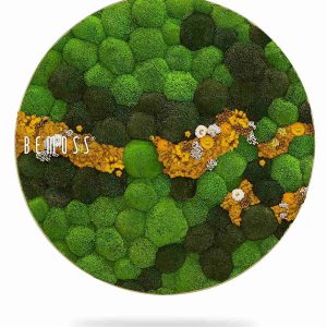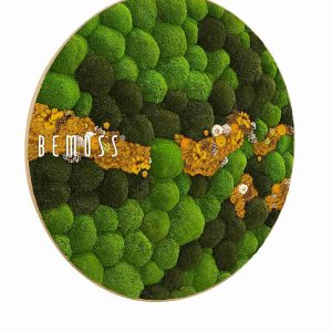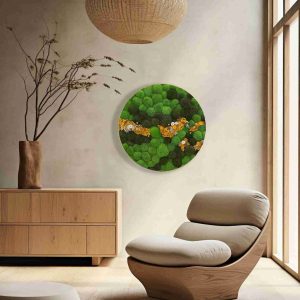 Moosbild Rund KUGELMOOS COSMO Yellow ist ein prachtvolles Naturaccessoire, das Frische und positive Energie in Ihr Zuhause bringt. Sattgrüne Mooskugeln bilden eine reiche, dreidimensionale Textur, während gelbe und cremefarbene Details an Sonnenstrahlen erinnern, die durch den Wald dringen. Die Gesamtkomposition ist harmonisch und strahlend und belebt jede Wand als auffälliges Designelement.