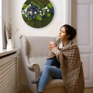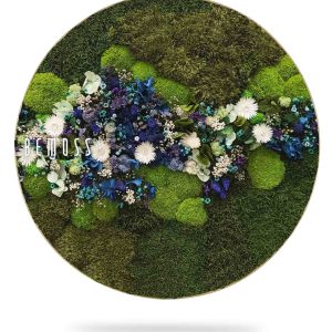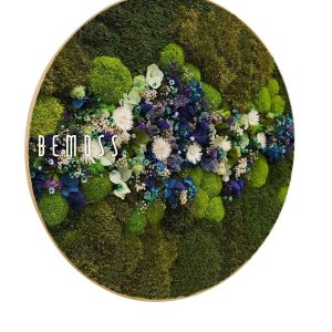 Das Moosbild Rund PFLANZEN Acebo BLUE zeigt eine harmonische Verbindung aus Natur und Eleganz. Dunkelblaue Akzente verschmelzen mit weißen Blüten auf grünem Mooshintergrund. Dieses einzigartige Kunstwerk handgefertigt in der Schweiz ist pflegefrei, ökologisch und hypoallergen – ideal für ein stilvolles Interieur.
