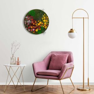 Das Moosbild Rund PFLANZEN Parra ist eine Feier der Farben und der Schönheit der Natur, die perfekt mit modernem Interior Design harmoniert. Dominante gelbe, orange und rote Blumen, verteilt auf einem grünen Hintergrund aus stabilisiertem Moos, erzeugen den Eindruck einer blühenden Wiese. Beim Anblick dieses Bildes können Sie fast den Duft des Sommers und die warme Atmosphäre sonniger Tage spüren.