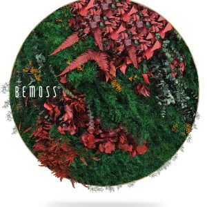 Das Moosbild Rund PFLANZEN Zorita ist ein wahres Kunstwerk, das das Gefühl der herbstlichen Natur direkt in Ihr Zuhause bringt. Die satten Grüntöne, die an einen frischen Waldboden erinnern, werden durch feurige rote Farne und zarte orange Akzente ergänzt. Diese Farbharmonie evoziert die melancholische Schönheit eines lebendigen, warm getönten Herbstwaldes.
