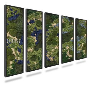 BEMOSS® ORTHO BLUE ist ein einzigartiges Moosbild-Set, das mit modernem Design und einer tiefen Verbindung zur Natur begeistert. Jedes der fünf Paneele zeigt eine fein abgestimmte Komposition aus verschiedenen Moosarten – von sattem Grün bis hin zu tiefem Blau, die durch ihre mehrfarbige Struktur hervorstechen. Helle cremefarbene Akzente setzen einen spannenden Kontrast zu den dunkleren Elementen und verleihen dem Gesamtbild Tiefe und Dynamik. Diese Kombination aus Farben und Texturen passt perfekt in moderne, minimalistische oder naturnahe Interieurs.