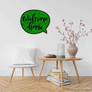 Diese einzigartige Dekoration verbindet modernes Sprechblasen-Design mit der Sanftheit des stabilisierten Mooses, das durch seine natürliche grüne Farbe dominiert. Der Schriftzug „Welcome Home“ in elegantem Schwarz unterstreicht die gemütliche und einladende Atmosphäre.