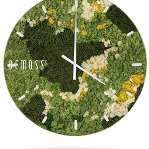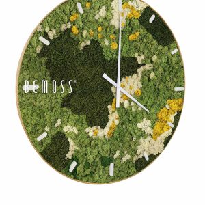 Die Moosuhr BEMOSS® ORTHO YELLOW mit Ziffernblatt ist die perfekte Verbindung von Funktionalität und originellem Design. Die Oberfläche der Uhr besteht aus stabilisiertem Moos in verschiedenen Grüntönen, ergänzt durch kontrastreiche cremefarbene und gelbe Akzente. Diese lebendige Farbkombination erinnert an eine blühende Wiese voller Leben und Frische.