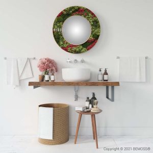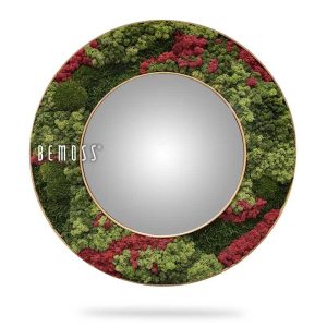Das runde Spiegel BEMOSS® ORTHO Burgundy verbindet Funktionalität und natürliche Ästhetik in einem einzigartigen Design. Der Spiegelrahmen ist handverziert mit 100% natürlichem, stabilisiertem Moos, das in Schattierungen von tiefem Grün und reichhaltigem Burgunderrot spielt. Dieser kontrastreiche Look verleiht dem Raum Energie und schafft gleichzeitig ein gemütliches Ambiente.