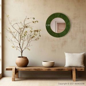 Beleben Sie Ihren Raum mit der einzigartigen Kombination aus Natur und Eleganz mit dem runden Spiegel FLACHMOOS Natural! Der Rahmen, bedeckt mit 100% natürlichem, stabilisiertem Moos in frischem Grün, verleiht dem Interieur einen natürlichen Akzent und benötigt keine Pflege, da er pflegeleicht und hypoallergen ist.
