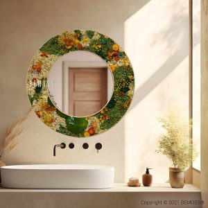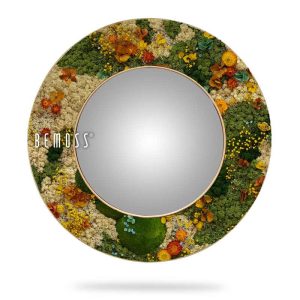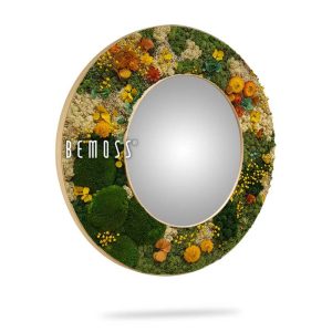 Der runde Spiegel PFLANZEN Cadalso ist ein originelles Designobjekt, das Funktionalität mit der lebendigen Schönheit der Natur verbindet. Der Rahmen besteht aus 100% natürlichem, stabilisiertem Moos, das seine Farbe und Weichheit ohne jegliche Pflege behält. Dieses einzigartige Design wird durch pflanzliche Elemente in warmen Gelb-, Orange- und Grüntönen ergänzt, die ein Gefühl von Harmonie und Frische schaffen.